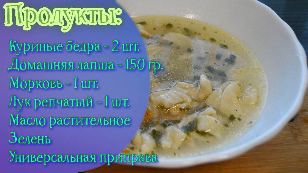 Всем привет, сегодня я приготовлю наваристый супчик с курицей и домашней лапшой. Если вам лень читать, то вы можете посмотреть этот видео-рецепт: Для приготовления этого супа нам понадобятся следующие ингредиенты: Первым делом ставим варить куриные бедра на небольшой огонь на 1 час, можно и больше. В это время подготавливаем зажарку к нашему супу. Нарезаем соломкой морковь, кубиками репчатый лук и обжариваем все до золотистого цвета на небольшом количестве растительного масла. фото листать вправо ›››››››››››››››› По истечении одного часа, достаем куриные бедра, даём им остыть, отделяем мясо от кости и нарезаем его на порционные небольшие кусочки. фото листать вправо ›››››››››››››››› Далее, возвращаем уже нарезанное мясо в наш бульон и туда же закидываем зажарку. Тут же закидываем лавровый лист и свою любимую приправу, лично моя любимая приправа это "универсальная" фото листать вправо ›››››››››››››››› За 2 минуты до готовности закидываем нашу настоящую домашнюю лапшу собственного приг