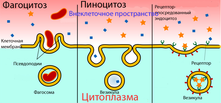 Фагоцитоз — активное захватывание и поглощение микроскопических инородных живых объектов (бактерий, фрагментов клеток) и твердых частиц одноклеточными организмами или некоторыми клетками многоклеточных животных. Способность клеток захватывать и переваривать частицы лежит в основе питания примитивных организмов. В процессе эволюции эта способность перешла к специализированным клеткам соединительной ткани — фагоцитам, выполняющим защитную функцию в многоклеточном организме. Явление фагоцитоза было обнаружено И.И.Мечниковым в 1882 году, а в 1883 году он докладывал о нем на очередном съезде врачей и естествоиспытателей в Одессе. Активно фагоцируют также клетки, выстилающие полость тела, лейкоциты. В процессе фагоцитоза активная роль принадлежит клеточной мембране, которая обволакивает фагоцитируемую частицу и втягивает в глубь цитоплазмы с образованием фагосомы. Из лизосом клетки в фагосомы поступают ферменты, переваривающие поглощенную частицу. Непереваренные частицы могут оставатьс