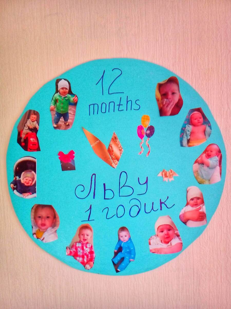 Для этого понадобится фанера, электролобзик, краски, ваше творчество и фотографии вашего малыша от рождения до 11 месяцев. Итак чертим круг на фанере, а затем вырезаем. Красим в любой цвет, в зависимости от пола ребёнка. Далее нужно будет вырезать фотографии и наклеить их в соответствии с возрастом, то есть фото месячного малыша располагаем на уровне цифры один и так далее, до 11. По центру пишем имя, а дальше ... пусть вашей фантазии не будет границ.