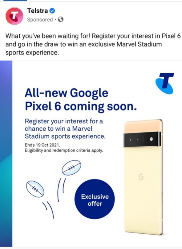 🇬🇧 Australian telecom operator showed a possible date of Pixel 6 presentation Australian operator Telstra has launched a Facebook ad encourages you to register your interest in the upcoming lineup to stand a chance of winning a Marvel Stadium sports experience. The offer ends on October 19. This is the same date seen on the watch widget shown in the Instagram Made by Google post. 🇷🇺 Австралийский оператор связи показал возможную дату презентации Pixel 6 Австралийский оператор Telstra запустил рекламу на Facebook с предложением подать заявку на покупку предстоящей линейки, чтобы получить шанс выиграть спортивное развлечение на стадионе Marvel. Предложение кончается 19 октября. Это та же дата, которая видна на виджетах часов, показанных в посте Instagram Made by Google.