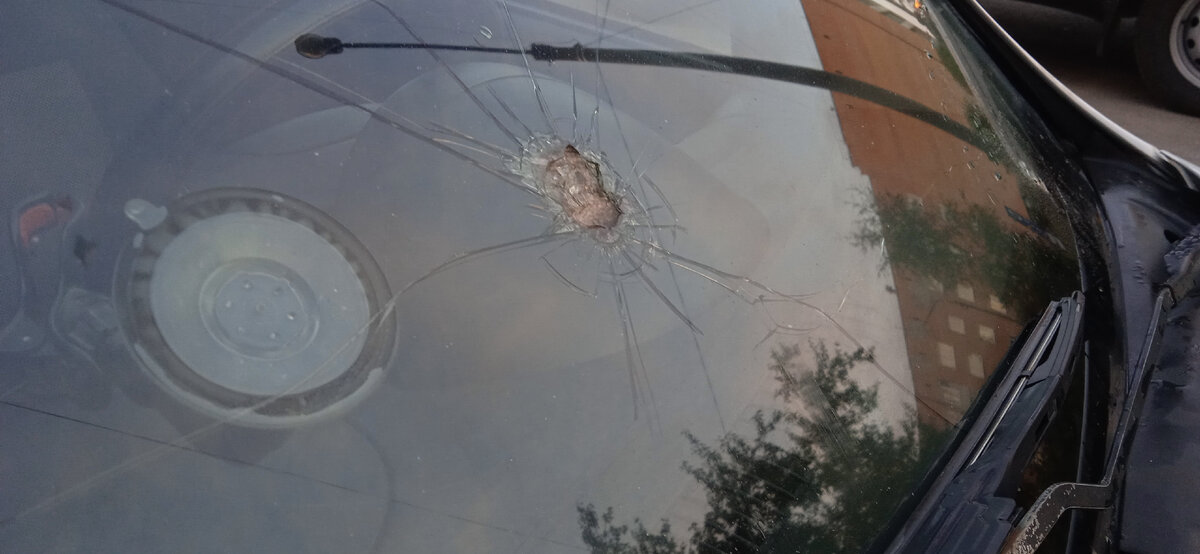 Вот что бывает когда из-под фуры на скорости 80-90км в час влетает камень :) Сказать что я был в удивление это ничего не сказать. Сначала честно даже не понял такой сильный хлопок был, что аж глаза закрыл, начал тормозить, смотрю у меня вся торпеда в крошках от стекла. Давай звонить в страховую вдруг прокатит:) Не прокатило это не страховой случай, но слава богу что не в голову, а так неизвестно вообще что было. Это еще раз доказывает, что на дороге бывает всякое и нужно быть готовым к любым ситуациям, а стекло это стекло, все меняется, обидно что оно было родное, не меняное, ну ничего, как говорится все что не делается, делается к лучшему. Удачи на дорогах!