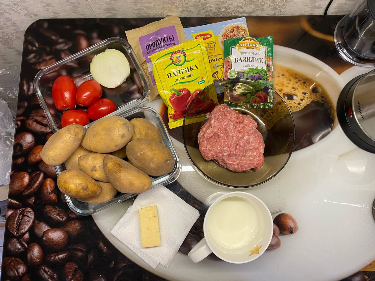 Довелось в первый раз в жизни приготовить себе самостоятельно. Безусловно, до этого я варил пельмени, сосиски или отваривал яйца, но всё это, словно писать бульварный роман. А вот когда готовишь что-то действительно стоящее, то создаётся ощущение, будто садишься за огромный роман. Берёшь чернила (продукты) и творить на бумаге (на плите/духовке). Всегда обожал картофельную запеканку, поэтому именно её и решил сделать венцом ужина. Для классического рецепта нам пригодится картофель, помидоры, лук, домашний фарш, сыр и приправа: паприка, чеснок, базилик и болоньезе. Всё аккуратно чистим, приготавливаем, размораживаем фарш и готовимся к творению. Достаём холст - в нашем случае сковороду. Поливаем подсолнечным маслом, после чего укладываем обжаривать фарш, помидоры, лук (по данной схеме). Сверху накидываем необходимые приправы, в том числе соуз болоньезе - именно он делает подобную запеканку настолько вкусной и аппетитной. В это время, пока жарится фарш со всеми составляющими, моем и очищае