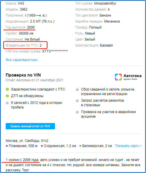 VIN из отчета и из ПТС имел много общего, почти все буквы и цифры, кроме последних двух: 42 против 28. Глядя на это все я подумал, что вряд ли тут сайт виноват в подмене символов, да и опечатка маловероятна, а вот намеренная подмена возможна, но зачем? Далее на проверку пошел новый VIN и тут я увидел, что характеристики у машин под этими “винами” одинаковые. То есть, скрывая что-то важное, Джон нашел идентификатор от такой же машины, чтобы сайт не распознал несоответствие характеристикам в ПТС. Также нашлось 1 размещение летом 2021 года с фотографиями и коротким описанием: