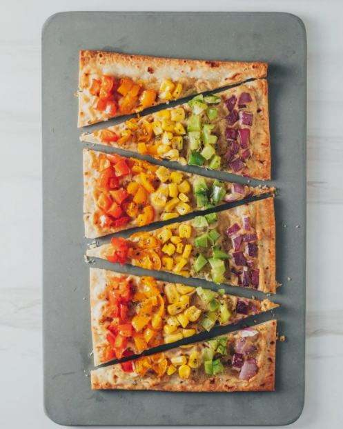Попробуйте радугу с этой вкусной и здоровой веганской пиццей с радужным лепешечным хлебом! Наполненный разноцветными овощами и хумусом, это праздник не только для вашего живота, но и для ваших глаз! Ингредиенты 1 разогретая лепешка 1/4 красной луковицы 1/4 зеленого болгарского перца 1/4 стакана кукурузных зерен 5 апельсиновых помидоров черри 1/4 красного болгарского перца 2 столовые ложки хумуса Черный перец, по вкусу Инструкция Примечания