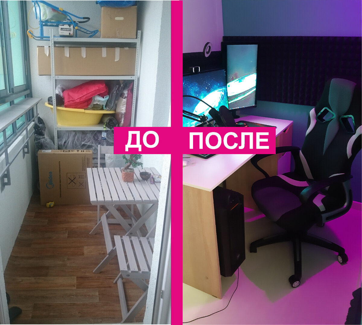 Приветствую! Итак, что мы имеем. Лоджия с отделкой от застройщика площадью примерно 3.6 кв.м (2700Х1340 мм) и желание создать на ней отдельную рабочую зону для ведения стримов, что бы "не мешать" семье в составе жены и ребенка 6-ти лет. Выглядело это вот так: