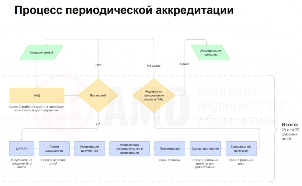 При этом всем работникам сферы здравоохранения стоит учитывать, что процедура Периодической аккредитации по минимальным подсчетам может занимать около 28 дней. Сам Минздрав ранее указал, какое количество времени относится на рассмотрение заявлений, их проверку, изучение. Кроме того, нельзя забывать о различных форс-мажорных ситуациях, которые также могут повлиять на продолжительность процедуры.