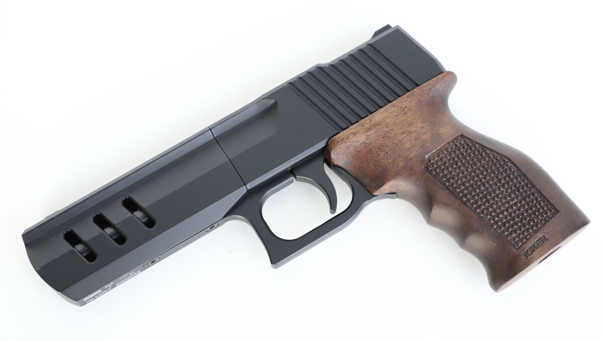 Рукоятка из ореха элегантно дополняет конструкцию, делая пистолет внешне более привлекательным и подчеркивая качество изготовления изделия.
