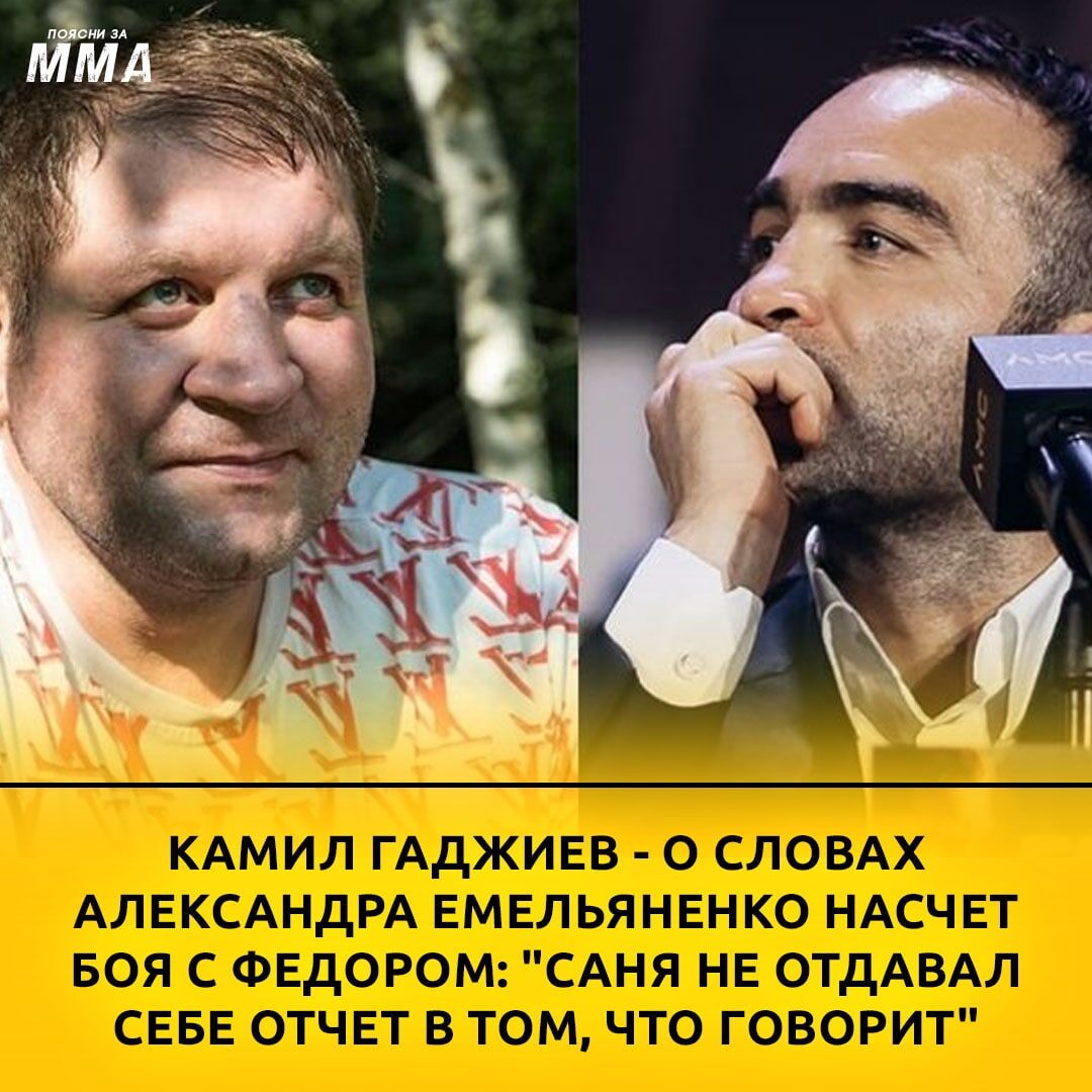 ❗️Глава лиги AMC Fight Nights Камил Гаджиев заявил, что при встрече обсудит с Александром Емельяненко его заявление о готовности подраться со старшим братом Федором. 🗣"Мне кажется, что Саня не отдавал себе отчет в том, что говорит. У меня здесь и к журналистам есть вопросы. Я понимаю, что кто-то делает что-то ради хайпа. Может, работа такая, но, на мой взгляд, не надо это вообще муссировать. Говорят, что когда брат пойдет на брата - это символ конца света. Я вообще считаю, что ни один россиянин не должен всерьез рассуждать о поединке с Федором Емельяненко. А то, что это брат, - вообще из ряда вон выходящая ситуация. Если я Сашу увижу, то скажу ему: "Сань, мне кажется, что не нужно так говорить. Я надеюсь, что ты так на самом деле не думаешь". Может быть, там другая версия будет. Скажет: "Да, я хайпонул". Я не верю, что он всерьез об этом думает", - сказал Камил Гаджиев в интервью Александру Лютикову.