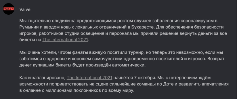 Valve вернёт деньги за билеты на The International 2021, турнир будет проведён без зрителей. Решение принято на фоне новых локальных ограничений и роста случаев заболевания COVID в Румынии. Ранее комитет по экстренным ситуациям Бухареста ужесточил правила посещения спортивных мероприятий. 1 октября стало известно, что китайские комментаторы не поедут в Бухарест и будут работать удалённо. Позднее от поездки отказался Питер 'ppd' Дагер, не озвучив причины своего решения.