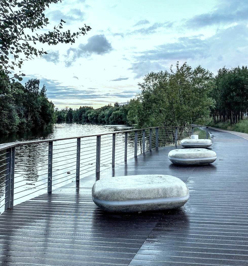 Этим летом в Петербурге появилась еще одно место для прогулок - парк на правом берегу Охты. Попасть в него можно зайдя с ул. Косыгина за Дворец молодежи. На входе вот такой арт объект. Кто-то закрасил дату, действительно она под большим вопросом. А эта скульптура еще в процессе работы. Участок набережной не очень большой, его можно пройти минут за двадцать спокойным шагом. Сначала идут деревянные настилы, далее песчаная дорожка. Заканчивается прогулочная зона недалеко от жд моста через Охту. Прогуляемся по набережной и парку. Есть несколько видовых площадок на реку. Можно полежать на удобных деревянных лежаках с видом на Охту. Посидеть на скамейке в виде огромной гальки. Смотрятся неплохо, но вот зимой на нее сесть будет наверное неприятно. Для детей есть детский городок, скейт-площадка. Можно поиграть в волейбол и баскетбол. Есть тренажеры под открытым небом и столы для пинг-понга. Вот такой волк спрятался среди деревьев. Для пробежек сделали дорожки, но вот похоже, качество у них не