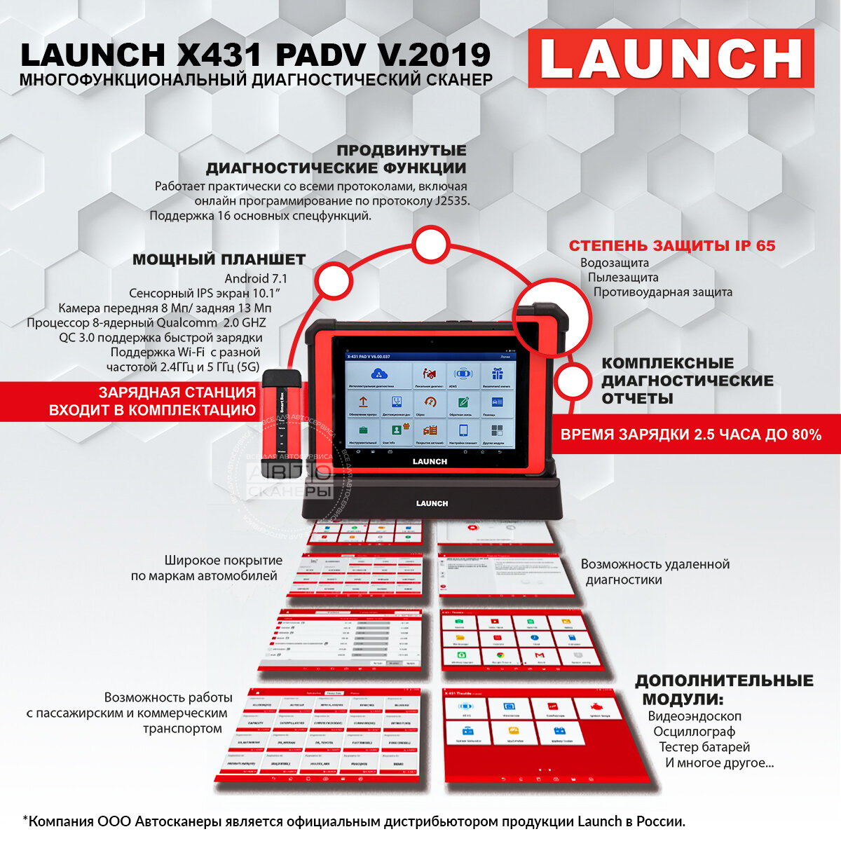 ВАЖНО: Описание на сайте производителя ТУТ Дата начала производства – 2019 год Дата окончания производства – н.м. Информация о LAUNCH PAD V Содержание: Инструкции LAUNCH PAD V Ø Инструкция по эксплуатации Launch X-431 PAD V Ø Упаковочный лист по кабелям Launch X-431 PAD V Ø Упаковочный лист по ПО Launch X-431 PAD V Ø Инструкция по активации грузового сектора для диагностического сканера Launch PADV Комплектация LAUNCH PAD V Ø Комплектация LAUNCH PAD V Дополнительные устройства к LAUNCH PAD V Ø Launch O2-1 - 4-х канальный осциллограф Ø Launch S2-2 - генератор сигналов Ø Launch PFP-100 - программируемое зарядное устройство Ø Грузовой комплект оснащения ПО+кабели для Launch PADV и PADVII Ø Wifi принтер для Launch X431 Ø Launch X-PROG 3 - Программатор ключей иммобилайзера Ø Launch BST-360- Беспроводной тестер аккумуляторных батарей Ø Launch X-431 TSGUN - Диагностический адаптер TPMS для сканеров Launch PRO/PRO3/PAD Ø Launch VSP-600 - видеоэндоскоп USB Обновление для LAUNCH PAD V Ø