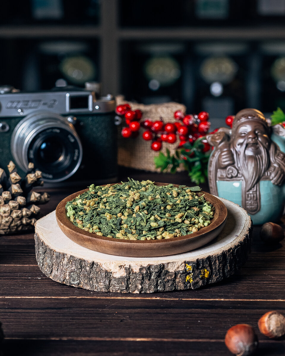 Генмайча - зелёный чай с обжаренным рисом на основе сенча с добавлением чая матча.
