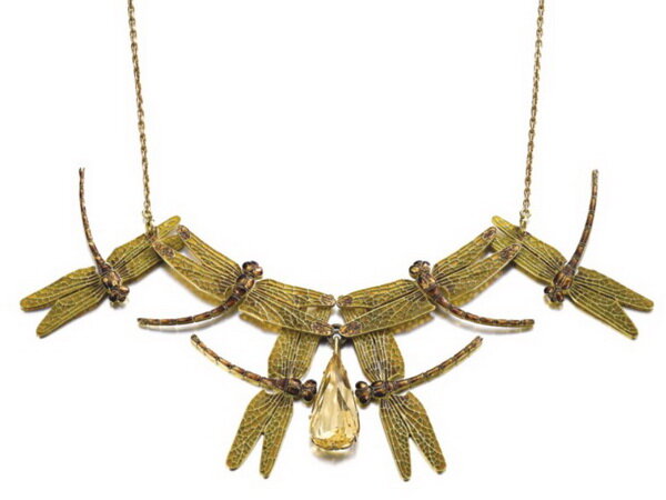 Бледнел померанцевый запад, В горах голубели туманы, И гибко, и цепко сплетались В объятьях над вами лианы. Сквозь кружева листьев ажурных Всплывали дворцов арабески, Смеялись алмазы каскадов Под их пробужденные плески. Вам слышался говор природы, Призывы мечтательных веток, И вы восхищалися пляской Стрекоз, грациозных кокеток... Игорь Северянин (1908) Колье из редкого чистого золота в виде роя коричневых эмалевых стрекоз с эмалевыми крыльями plique-à-jour вокруг капли цитрина в форме груши, Рене Лалик, около 1900 г. Очень тонкая и редкая брошь с горным хрусталем и бриллиантом, JAR, 1987 г. Эта брошь экспонировалась на ретроспективе «Jewels of JAR Paris». Золотой кулон с бриллиантами и изумрудами, приписывается Эндрю Грима Резная брошь из жадеита с бриллиантом в оправе из золота Золотое ожерелье с подвеской в виде стрекозы из горного хрусталя с бриллиантами и рубинами, BOUCHERON Платиновая брошь в виде стрекозы с леопардовым агатом и бриллиантами Бро