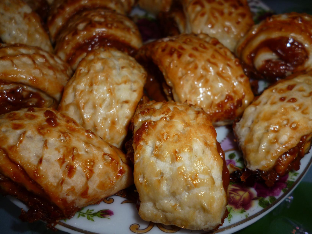 Ингредиенты:слоеное тесто- 500 г; вареное сгущенное молоко-1/2 банки; ядра грецких орешек-50 г; яйцо-1 шт; пинцет; нож с волнистым лезвием.
