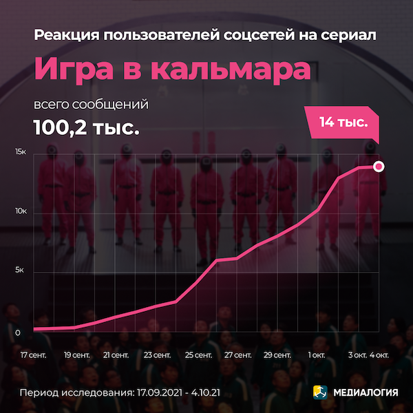 Стриминговому сервису Netflix, кажется, удалось создать “формулу зависимости”, выпустив очередной сериал, который заставил зрителей постоянно тянуться к кнопке “Следующий эпизод” и посмотреть все 8 серий без передышки. Новый южнокорейский сериал “Игра в кальмара”, мировая премьера которого состоялась 17 сентября 2021 года, мгновенно возглавил общемировой рейтинг стриминга в большинстве стран и стал новым популярным трендом в TikTok. Используя систему Медиалогия, проанализировали реакцию пользователей соцсетей на сериал “Игра в кальмара”. Только за первые две недели с момента выхода шоу (с 17 сентября по 4 октября) было зарегистрировано более 100 тыс. сообщений на эту тему, и их количество продолжает расти. Больше всего упоминаний сериала в TikTok - 33 тыс. *Внимание! Дальнейший контент содержит спойлеры. Пользователи активно обсуждают южнокорейский триллер в соцсетях: некоторые осуждают его за жестокость, другие восхищаются сюжетом и философским подтекстом, а юные тиктокеры между тем а