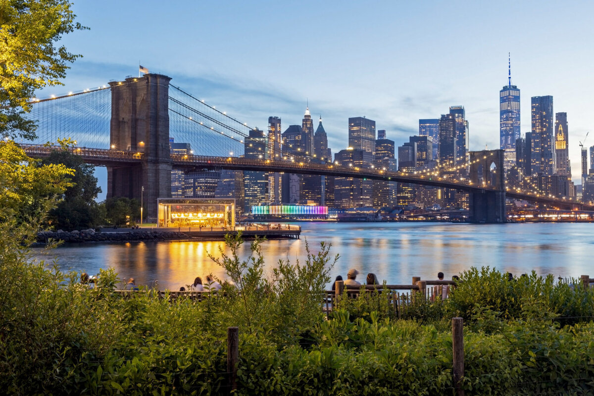 Но главное здесь – это совершенно захватывающие виды. На знаменитом постере фильма “Однажды в Америке”, который я уже упоминала, размещен снимок, сделанный в Дамбо (начинающие гангстеры отправились туда проворачивать свои темные делишки): опоры Манхэттенского моста виднеются между двумя зданиями из красного кирпича. Этот кадр сделан на Вашингтон-стрит, и в дневное время это место никогда не пустует: чтобы сфотографироваться, вам придется потолкаться локтями с инстаграм-блогерами, которые устраивают тут полноценные фотосессии. Но зачем вам фото, которое есть у всех? Лучше пройдите к берегу, полюбуйтесь Манхэттенским и Бруклинским мостами и панорамой города, а затем отправляйтесь на юг вдоль Ист-Ривер, гулять по сумасшедше красивому парку. В самом начале его, на огромном газоне Харборвью, летними вечерами показывают кино: натягивают экран и после захода солнца включают проектор. Ты сидишь на своем одеялке среди разных приятных людей – тут и кучки подростков, и романтические парочки, и пенсионеры, и компании с детьми и собаками, – смотришь какой-нибудь старый фильм, от которого наворачиваются слезы, взглядываешь на ночное небо и манхэттенский скайлайн, и единственная мысль, которая приходит тебе в голову, это: “Какая хорошая штука – жизнь”. Серьезно, не вру. Причем за такое удовольствие даже не берут денег!