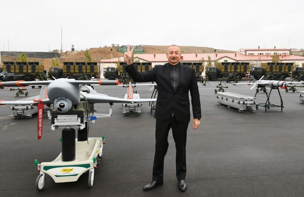 Президент Азербайджана Ильхам Алиев, позирует на фоне израильских беспилотников возле иранской границы - именно кадры этого позирования вы видите вверху на фотографиях.