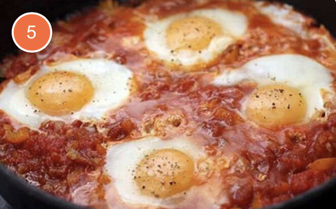 На сковороде нагрейте масло, нарежьте лук небольшими кубиками и помешивая не долго обжарьте – 2-3 минуты. Болгарский перец очистите от внутренностей, порежьте мелко, выложите к луку и продолжите обжарку еще столько же. Очистите от кожицы помидоры, поделите на более мелкие части, добавьте к остальным овощам, поперчите, посолите и помешивая доведите до легкого закипания. Как только помидоры пустят сок, аккуратно вбейте яйца не повредив желтки по всей сковороде.