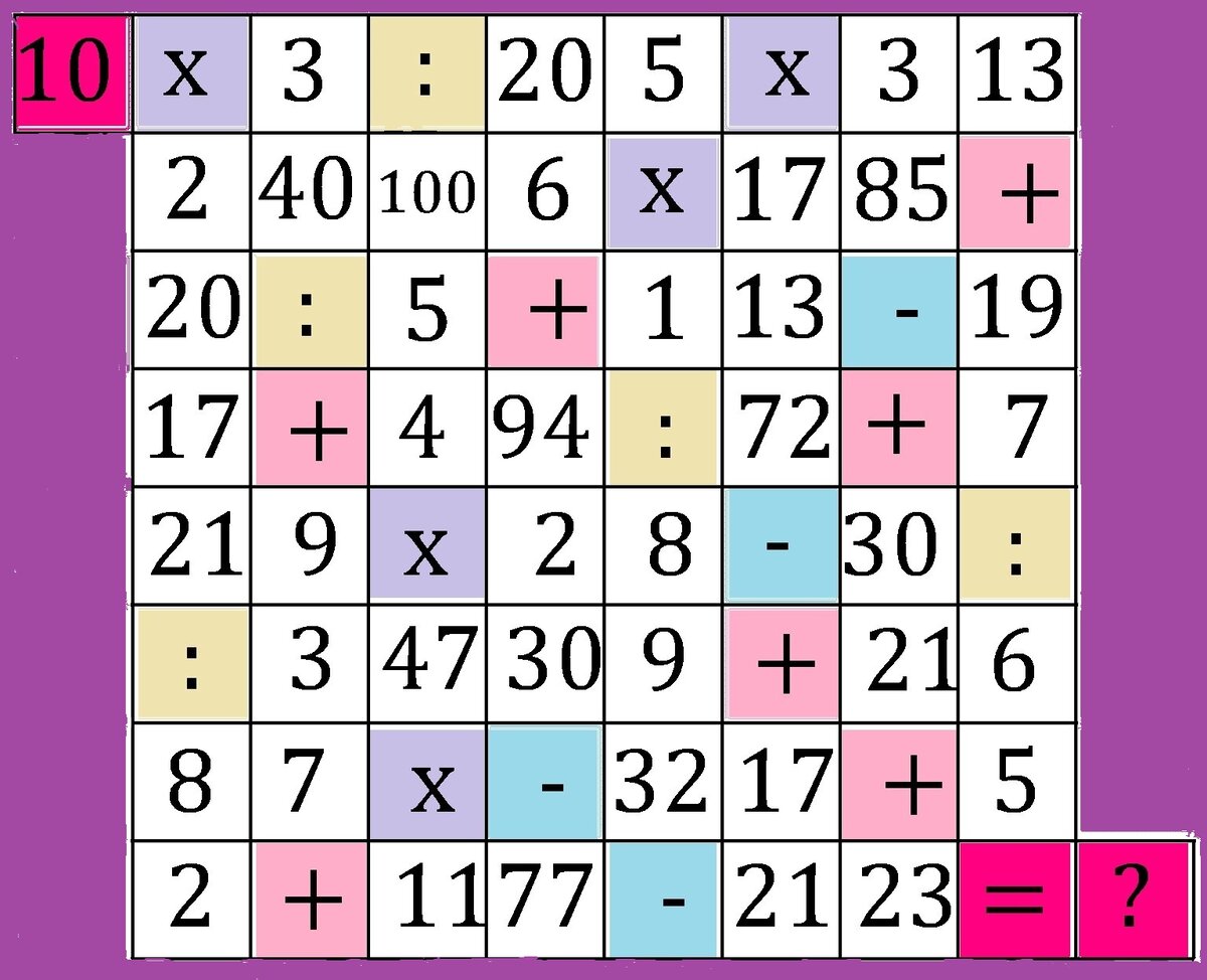 Дорогие читатели, здравствуйте! Сегодня предлагаю вам пройтись по математическому лабиринту. Задание простое: начиная с 10 двигаться по клеткам влево, вправо, вверх, вниз, выбирая единственно правильное решение примера. Если пример "перестал решаться", значит вы пошли неверным путем, либо неправильно произвели арифметическое действие. В конце вы должны оказаться у знака равенства с правильным ответом. Желаю удачи! Свой ответ оставляйте в комментариях. Если вам нравятся такие задания, предлагаю решить еще: Небольшая головоломка для тех, кто в пути Три быстрые задачи на логику Математический шифр Подписывайтесь на мой канал и не забудьте поставить лайк)