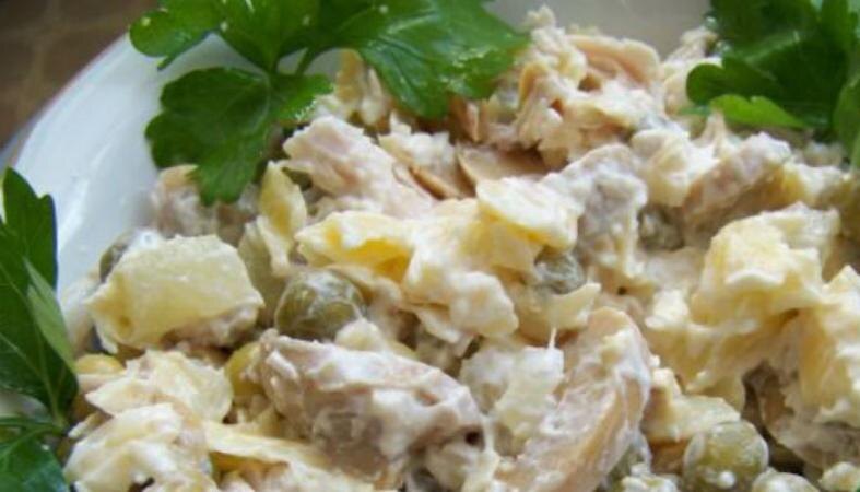 На выходных с мужем были на свадьбе моей двоюродной сестры в ресторане, в центре города. Было такое большое разнообразие вкусных и необычных блюд, как нибудь позже о них напишу. Сегодня хочу уделить внимание салату, который мне понравился больше всех. И это салат необычным названием «Пино-Колада». Салат был действительно вкусным, что подтолкнуло меня на мысль приготовить его самостоятельно. Но перед этим решила, в интернете, поинтересоваться стоимостью этого блюда. Я была удивленна, что стоимость такого салата колебалась от 850 рублей и выше за небольшую порцию. Нашла на одном из женских форумов рецепт салата и решила незамедлительно приготовить такой же на ужин. КБЖУ на 100 г блюда: Ккал - 92.2 Белки - 10.8 г; Жиры - 3.6 г; Углеводы - 5.4 г; Для заправки смешиваем сметану с горчицей и добавляем по вкусу чёрный перец. По желанию можно добавить немного сока лимона. Блюдо по подсчетам вышло калорийным, но таким вкусным, что совсем не хочется обращать внимания на эти калории. Да,