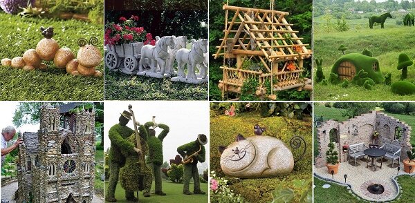 Кое-что из представленного можно воплотить в жизнь своими руками — при условии наличия «золотых рук», времени и денег. На остальное просто полюбуйтесь, чтобы получить эстетическое наслаждение! Живые скульптуры Живые скульптуры в саду — это нечто! Лошади, везущие карету с цветами, гигантские пчелы или оркестр могли бы стать роскошным украшением газона. Теоретические познания о том, как создаются такие скульптуры, можно получить из статьи Как сделать живую садовую скульптуру своими руками. Искусственная трава Если вы видите на фото необычайно идеальную зеленую скульптуру, скорее всего покрытие выполнено из искусственной травы. Большим преимуществом данных скульптур является их неприхотливость. За ними не нужно ухаживать в плане полива и реставрации покрытия. Срок службы — 10 лет, «искусственность» видна только при близком рассмотрении. Кованая беседка Ажурная кованая беседка удовольствие дорогое, но стоящее. Это красиво, стильно, роскошно! Летом может служить опорой для плетистого растен