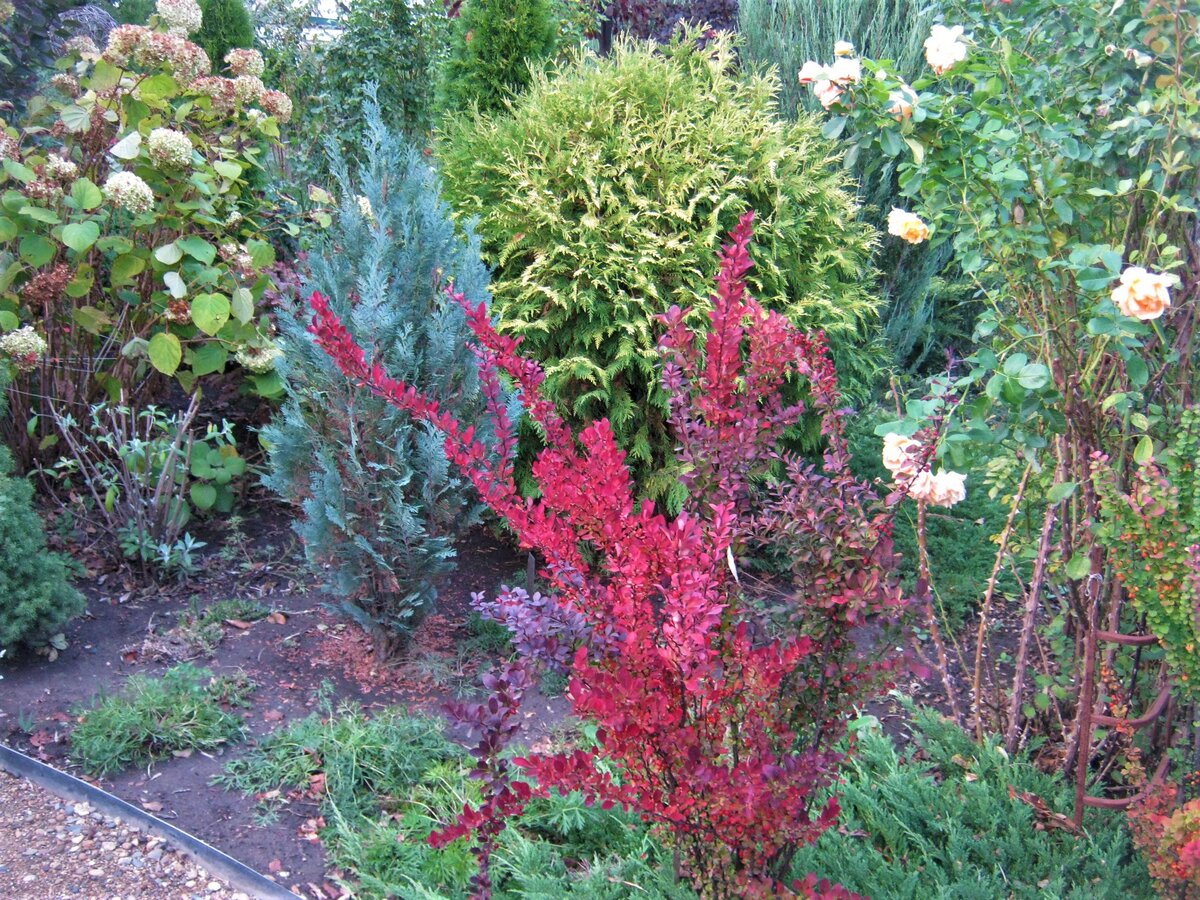 В моём саду барбарисы занимают первое место среди лиственных растений по количеству сортов и красоте. Их у меня больше 20 сортов. Считаю их самыми малоуходными растениями. Основное их достоинство - красота листьев, разнообразие цвета с ранней весны до поздней осени. Не нужно убирать листья, они просто превращаются в мульчу. Поливаю только в самую жару . Даже в зимнюю пору они украшают сад своими ягодами. Сад мой находится в Краснодарском крае. Участок 20 соток. Это барбарис "Пау Вау" . У него из всех барбарисов, самые крупные ягоды. С такими яркими ягодами он стоит всю зиму. Даже весной, когда начинают распускаться листья, на нём ещё висят ягоды. Барбарисы в октябре начинают быстрее менять свой цвет. Они каждый день могут быть другими. За их красотой можно наблюдать весь октябрь. Здесь на фото слева барбарис "Грин Карпет". Справа "Ред Рокет". Барбарис "Грин Карпет" только начал менять цвет. Позднее он будет ярко- оранжевым. Справа растёт ёлочка "Коника" Этого барбариса сорт не
