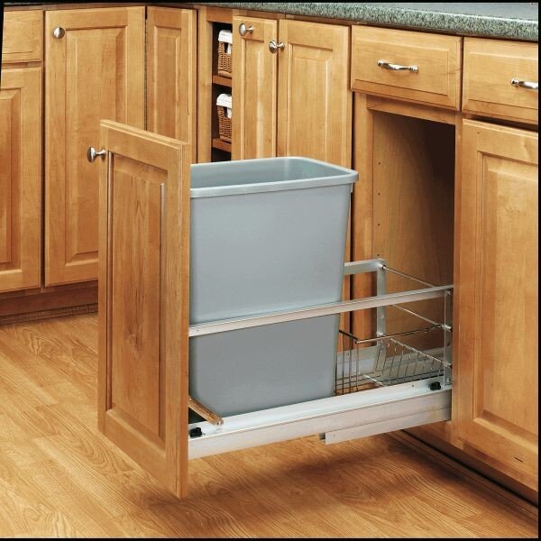 Теперь только так. Годами мы, как то не заморачивались. Шкаф под мойкой становился пристанищем мусорного ведра по умолчанию, и естественно он закрывался относительно большой дверью, а то и двумя при размере шкафа к примеру 800 мм и более. Судьба шкафа предопределялась в первые же дни эксплуатации. Хорошие идеи приходят не сразу. Почему мы так делали? Ответ прост - так легче. Изготавливая мебель многие не хотят тратить ресурсы на размышления об удобстве. Так же поступали и мы. Лишь в тот момент когда оптимизация систем хранения стала нашей страстью мы начали задумываться. Основной проблемой мусорного ведра находящегося под мойкой - это постоянные трудности получить доступ к нему во время использования мойки кем то другим. Согласитесь, все мы сталкивались с такой проблемой. Зачем нужен огромный шкаф зачастую в 800 мм шириной в котором хранится ведро, много хлама и остальное пространство занято сантехническими системами. Дорого... Совсем не обязательно прибегать к покупке дорогостоящего