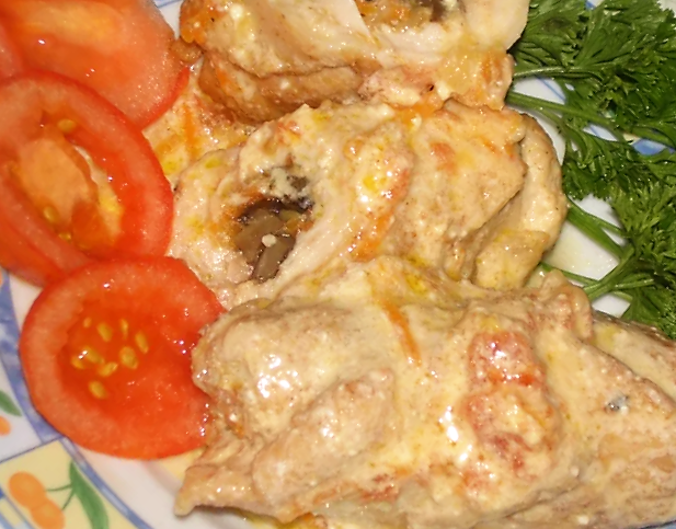 Совет:Вместо грибов можно положить кусочки бекона, вяленый чернослив и молотые грецкие орехи. Сочетание этих двух ингредиентов, тоже превосходно подходят к куриному филе