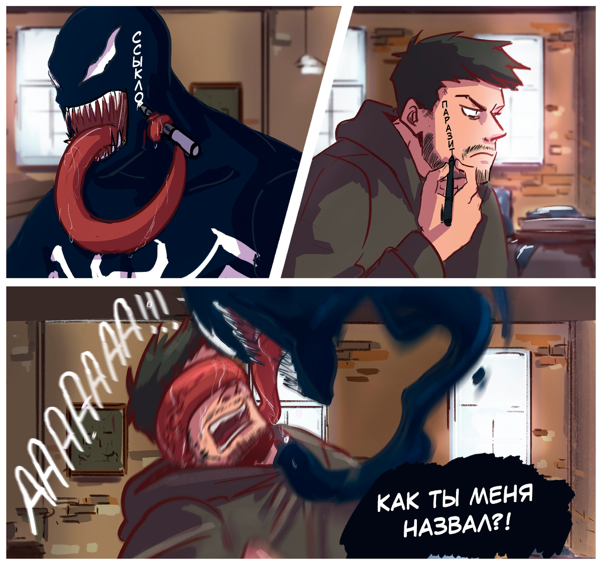 30 сентября 2021 года в России состоялась премьера фильма «Веном 2» (в оригинале - «Venom: Let There Be Carnage») - второй части супергеройского фильма, основанного на персонаже издательства Marvel Comics. Веном - это инопланетный симбиот, который живет в теле своего носителя - журналиста Эдди Брока. Также в новом фильме появился еще один известный симбиот из комиксов - Карнаж, носителем которого стал злодей по имени Клетус Кэседи. Уже сейчас можно сказать, что «Веном 2» успел собрать приличную кассу во всем мире и стал популярен среди зрителей. А популярные фильмы всегда попадают в поле зрение сетевых художников, так что сегодня я собрал для вас несколько смешных комиксов, вдохновленных недавней киноновинкой. Как и в первой части «Венома», в свежем продолжении главные герои не переставали пытаться ужиться с другом, что, конечно же, то и дело превращалось в ссоры и ругань. Художница под ником FlipityFlip в одной из своих работ просто отлично передала атмосферу напряженности, царящую в