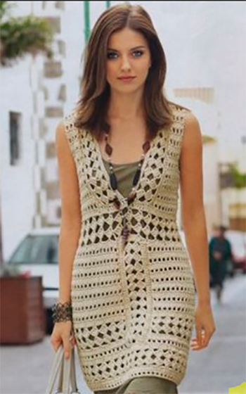 Сборка: выполнить плечевые швы на 6 (7) п. Выполнить боковые швы. Положить планки лиц. стороной последним р. на лицевую сторону скоса выреза, приметать и соединить оба края соед. ст. Пришить верхние короткие края к оставшимся 8 (9) ст. с/н плеча спинки, нижние короткие края пришить до середины к горизонтальному вырезу. Обвязать нижний край юбки 6-м р. полосатого узора, при этом выполнить его как лиц. р. и закончить 1 соед. ст. в 3-ю возд. п. подъема.
