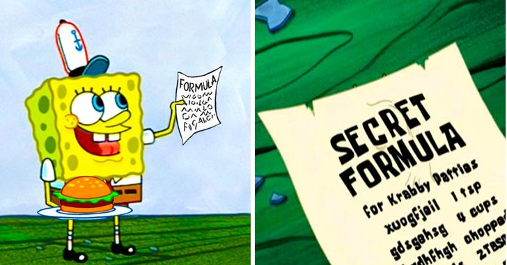 надеемся, что вы оцените наши старания лайком и подпиской!) 1. Секретная формула Крабсбургера Если вы когда-нибудь смотрели Спанч Боба, вы знаете, что Крабсбергер - популярный гамбургер, который подают в Красти Краб. В одном из эпизодов секретную формулу бургера можно увидеть с ингредиентами, показанными в виде случайной тарабарщины.