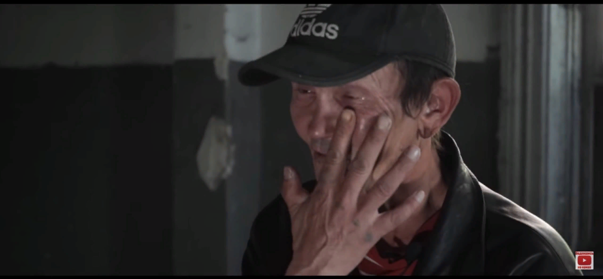 Спит Алексей среди мусора в заброшенном доме, где протекает крыша. Он спит на картоне и прикрывается им же. Несмотря на родную разруху, он остаётся человеком, о чём нам сам и говорит. Каждое утро он бреется в самодельном умывальнике и старается с его же слов: «Хоть немного походить на человека.