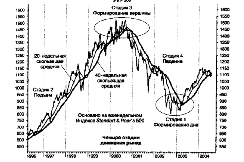 Скользящие средние могут использоваться для определения четырех основных стадий типичного рыночного цикла (смотри гра фик). Это выделение легко приводит к логичным портфельным стратегиям, которые соответствуют каждой фазе.