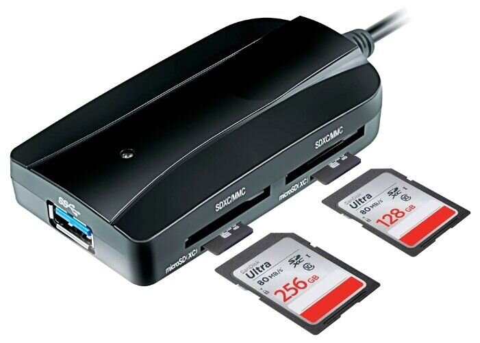На фронтальной панели кардридер оснащен 6 различными слотами для поддержки SD-карт и отдельным портом USB 3.0 для флеш-носителей (скорость чтения и записи данных — 104 и 120 Мб/с).