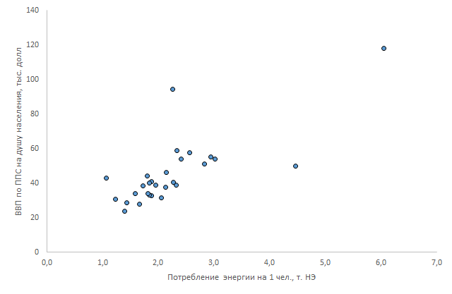 Начало Европейская энергоэффективность: сравниваем страны ЕС и составляем собственный рейтинг (часть 1) Интересная взаимосвязь наблюдается между такими показателями как подушевой ВВП по ППС и уровень энергопотребления на душу населения. Логично, что они как-то взаимоувязаны (коэффициент корреляции для ЕС составил 0,75). Большая часть стран (25 шт.) сгруппирована в довольно узком диапазоне значений энергопотребления. И также имеется 3 явных выброса: 1) по потреблению энергии - Финляндия, т.к. это северная страна (у нее низкий удельный ВВП для такого энергопотребления); 2) по удельному ВВП по ППС - Ирландия, тут не очень понятно (надо разобраться!), но у этой страны гораздо более низкое энергопотребление для такого высокого подушевого ВВП. Скорее всего, дело в структуре экономики, но это, как говорится, не точно; 3) и по удельному ВВП по ППС и по потреблению энергии - Люксембург. Это лидер рейтингов по уровню энергопотребления и по удельному ВВП. Теперь же перейдем к самым интересным д