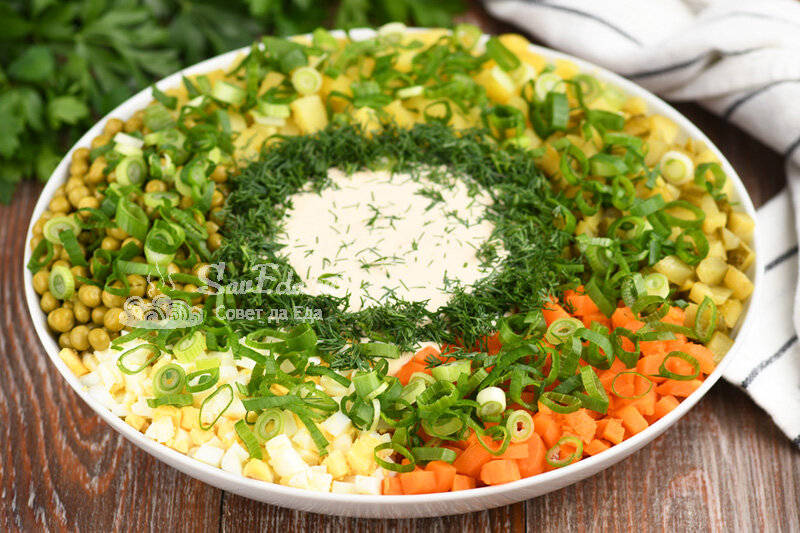 Такой салат Оливье точно стоит попробовать. За счет прекрасного рыбного соуса он получается необычным и очень вкусным. Соус готовлю за несколько минут и из нескольких простых продуктов. Соус дает салату потрясающий вкус. Порции 5 Время подготовки 40 минут Время приготовления 30 минут Ингредиенты Инструкции 1. Картофель, морковь и яйца отвариваем, остужаем и очищаем. Салат буду выкладывать на тарелке секциями. Ставим посередине тарелки стакан и добавляем кубики картофеля. 2. Рядом с картошкой размещаем кубики маринованных огурцов и моркови. 3. У яиц оставляем 2 желтка. Нарезаем яйца на кубики и размещаем на тарелке. 4. Добавляем секцию из горошка. 5. В чашу блендера выкладываем сметану, майонез, желтки, кусочки консервированного тунца без жидкости и дополняем все молотым перцем. Хорошо взбиваем и рыбный соус готов. Он получается очень вкусный. Тунец можно заменить на горбушу в собственном соку. 6. Стакан убираем и в пространство, которое образовалось, добавляем соус. По консистенции он