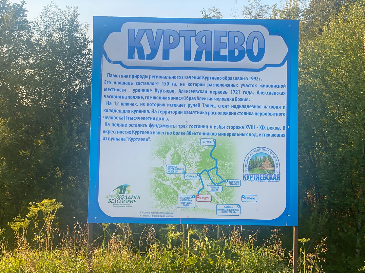 В Архангельской области, в 35 километрах от Северодвинска, есть незаслуженно забытое туристами урочище Куртяево, находящееся на месте потухшего вулкана. Тут находится источник минеральной воды, экологическая тропа протяженностью несколько километров, а во 2 веке до н. э. тут была стоянка древнего человека. А ещё от Куртяево вы можете дойти до церкви Святого Алексия. Первым делом мы решили прогуляться к источникам с «живой» и «мёртвой» водой (правда, по просьбе священника эти обозначения были убраны). В 2017-2018 годах тут всё отремонтировали в рамках акции «Сохраним родники Поморья». Так что прогулки здесь стали очень приятными. На территории урочища находится около 80 ключей минеральных вод, а источники проходят сквозь вулканическую породу. Кроме 80 ключей слабоминерализованных вод в урочище находится природный источник лечебно-столовой сульфатно-гидрокарбонатно-хлоридной натриевой воды с нейтральной-слабощелочной реакцией среды. Куртяевскую воду можно найти даже в московских магаз