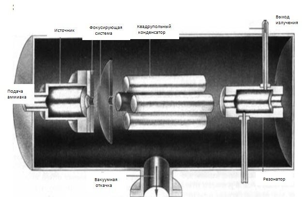 В источник 1 мазера нагнетается аммиак. Почему аммиак? Наверное, причин много: его много, он дешев, он безопасен и еще много других причин. Это я к тому, что кто-то сидел решал уравнение Шредингера и решение указало на большую вероятность в необходимости именно аммиака.