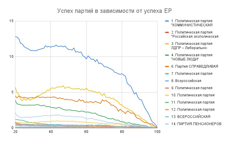 Я хочу выяснить какие политические силы из числа заметны системных партий (кроме ЕР) больше всего любит наша власть. Несколько недель перед выборами машина пропаганды, как сообщают отчеты аналитиков, мочила КПРФ и топила за партию "Новые люди". А как в итоге поступила с ними машина фальсификаций? На первом графике я показал усредненный процент партий от списочного состава избирателей, в зависимости от процента ЕР (отложен по горизонтали). На втором тоже самое, но пропорционально друг другу. Получается, что в правой части графиков мы видим самые сфальсифицированные результаты, а в левой самые честные. На втором графике мы видим, что 3 старые системные партии имеют разнонаправленные колебания, а партия "Новые люди" (зеленая линия) только и делает что снижается с ростом фальсификаций. Её рост в самом конце погоды не делает, так как там в общем пироге очень мало голосов. Это означает, что именно "Новые люди" больше всего теряли на участках с фальсификациями. Теряли не только относительно