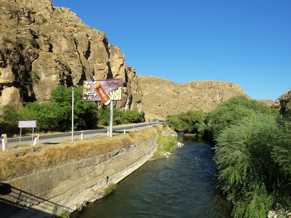 В каждой выемке его обрывов встречает ларёк с тёмно-красным домашним вином в пыльных пластиковых бутылках, а чуть пьянящие одним своим содержанием рекламные щиты натыканы часто, как линия электропередач. Винный фестиваль проходит всего один день в первую субботу октября, а винной столицей Армении Арени служит круглогодично.
