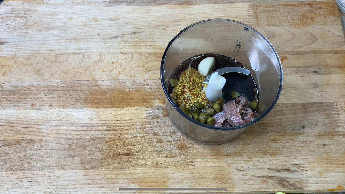 В блендер закидываем анчоусы, чеснок, каперсы, дижонскую горчицу, вустерский соус (ворчестер, можно заменить соевым соусом), сок лимона, пармезан.