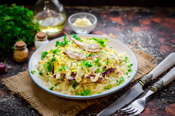 Слоеный салат со шпротами за 25 минут - оригинальный рецепт