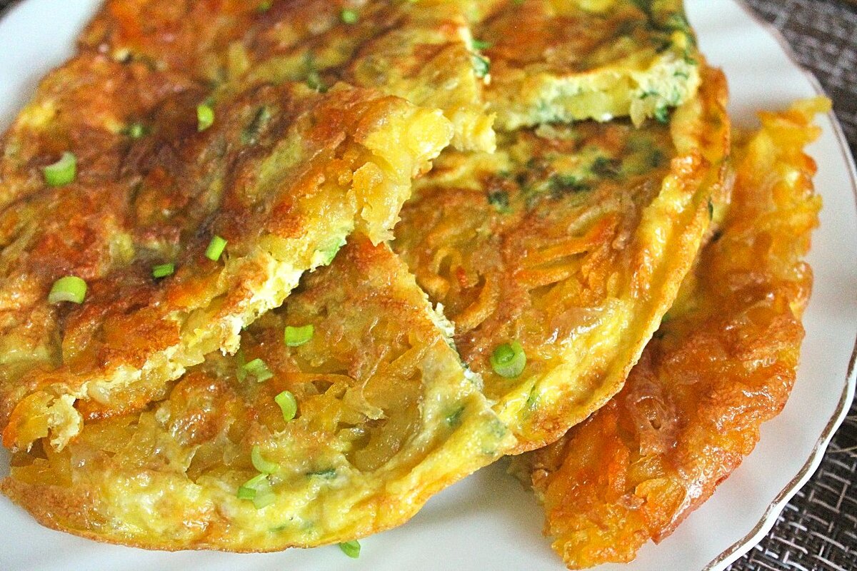 Приготовьте себе и своим близким вкусный и сытный завтрак из самых простых продуктов, которые всегда есть под рукой. Продукты: Картофель - 300-350 гр. Яйца - 3 шт. Масло растит. - 30 гр. Лук зеленый - 10 гр. Соль - по вкусу. ЛИСТАЙ≫ Картофель очищаем и натираем на крупной терке. Солим, перемешиваем и оставляем и оставляем на 5 минут. Отжимаем картофель от лишнего сока. ЛИСТАЙ≫ На сковороду наливаем растительное масло и разогреваем. Выкладываем картофель на сковороду и и обжариваем на среднем огне, часто помешивая, примерно 5-6 минут до мягкости картофеля. ЛИСТАЙ≫ За это время нашинкуем зеленый лук. В миску разбиваем яйца, солим по вкусу, добавляем зеленый лук и перемешиваем. ЛИСТАЙ≫ При помощи лопатки готовый картофель распределяем по сковороде. На картофельный блин выливаем ячную смесь., накрываем крышкой и готовим на небольшом огне примерно 5 минут, пока не схватятся яйца. Затем переворачиваем омлет на другую сторону, немного усиливаем огонь и подрумяниваем омлет около 2 мин