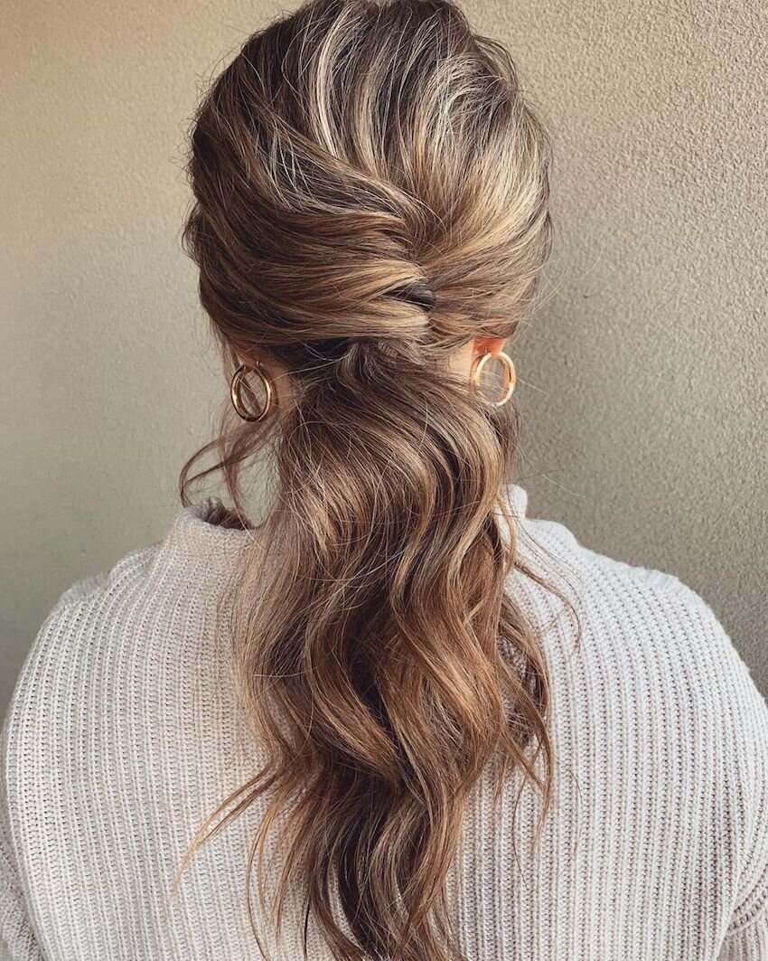 Ваши волосы, безусловно, вьются, но менее четко, что придает вам немного более шикарный беспорядочный вид в некоторые дни? Что ж, именно с такой текстурой вы можете создавать совершенно уникальные прически! Вместо того чтобы выглядеть супергламурно, вы можете попробовать что-то более рок-н-ролльное, например, эту прическа хвост с локонами в стиле Синди Лопер.
