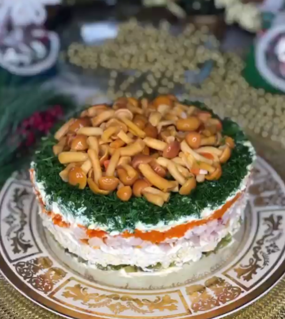 Вкусный и нарядный рецепт слоёного салата который подойдёт к любому праздничному столу - "Лесная поляна"