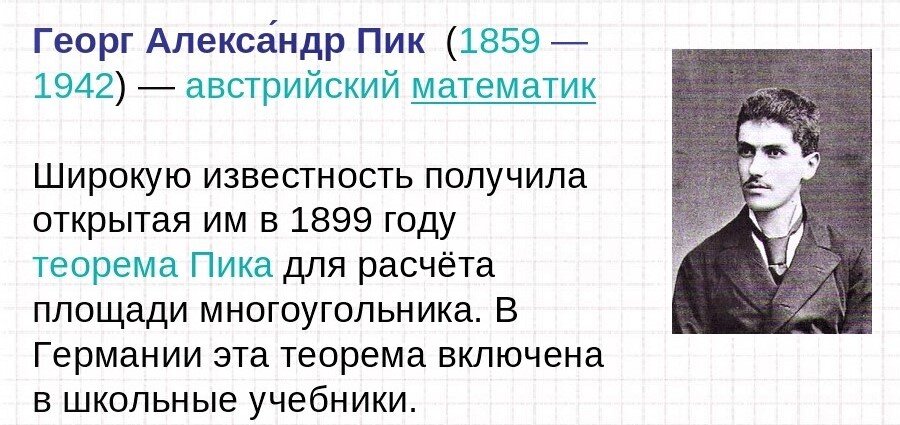 Сегодня мы поговорим об одной из формул для нахождения площади сложной фигуры. Ее иногда называют формулой для ленивых. Названа она в честь Георга Пика, доказавшего ее еще в 19 веке.