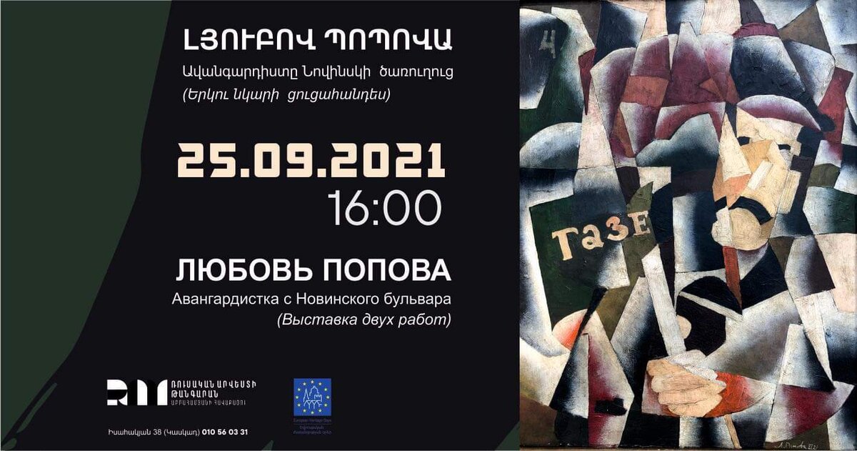 25 сентября в Музее русского искусства состоялось открытие выставки «Любовь Попова. Авангардистка с Новинского бульвара». Выставка приурочена к Дням европейского наследия. Музей русского искусства, основанный на частной коллекции профессора А. Я. Абрамяна, считает одной из своих миссий представлять широкой публике произведения из собраний современных коллекционеров. Произведения Поповой 1921-1922 гг. получили название «Пространственно-силовые построения». Основу композиции в них составляют горизонтальные и вертикальне или наклонные линии, как бы повисшие в абстрактном пространстве.Наиболее интересны кубистические работы Поповой, представляющие собой композиции с человеческими фигурами. На выставке экспонированы две неизвестные работы известного русского автора из коллекции Вардана Асцатряна, основателя Шушинского музея ковров. Эти картины были эвакуированы вместе с порядка 50 работами и ценной коллекцией ковров во время 44-дневной войны из Шушинского музея ковров. Как отметил Вардан