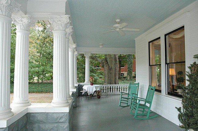 Интересная вещь: голубой цвет, которым красят потолок над крыльцом или верандой имеет собственное название «Haint blue» (произносят «хинт блю»), причем это не какой-то конкретный оттенок голубого, а любой из бирюзово-мятно-голубых. Если тем же точно цветом выкрашен потолок в спальне, про него скажут «голубой», но у крыльца это будет цвет «хинт».