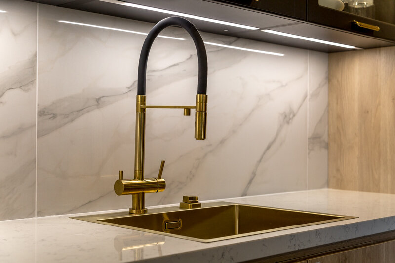 Смеситель изготовлен из высококачественной латуни, поверхность хромированная. Образующийся известковый налет быстро удаляется с помощью обычного моющего средства. Усилий для этого прилагать много не надо. Современная модель имеет богатый функционал, оснащена двумя изливами с подключением к фильтру. Оттенок устройства приятный - светлого золота, комбинированный с черным матовым материалом. Такое сочетание позволяет назвать смеситель оригинальной и стильной моделью, которая впишется в дорогой интерьер кухни.