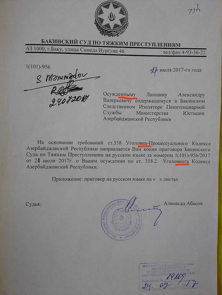 Какая страна, такой в ней и "грамотный" судья - Абасов Алиовсат Мазахир оглу (на фото). Именно этому грамотею, неспособному без ошибок написать семь строчек текста, доверили священный суд над опасным карабахским сепаратистом Лапшиным. А вот и сам судья - Недолгой была радость этих оболтусов, прыгавших от счастья что осудили российского блогера на 3 года тюрьмы за турпоездку в Карабах. Этим они пытались всему миру показать какой великий Азербайджан. Не прошло и месяца после вынесения этого приговора, как меня избили и придушили прямо в самой охраняемой тюрьме Азербайджана, показав тем самым, кто в Азербайджане хозяин и это точно не Ильхам Алиев. Перепуганный Алиев меня тут же помиловал два часа спустя после моего поступления в реанимацию, испугавшись что я умру в тюрьме и это повесят на него персонально. А 20.05.2021 Европейский суд признал сам Азербайджан виновным в издевательствах и покушении, обязав выплатить мне компенсацию. Как тут не вспомнить библейскую притчу, сказанную Иисус